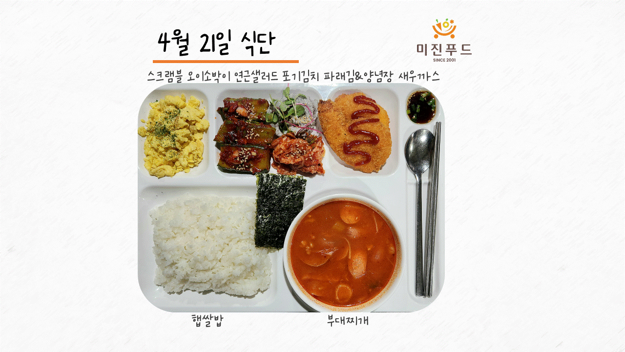 오늘의 식단: 햅쌀밥 부대찌개 새우까스 스크램블 오이소박이 파래김&양념장 연근샐러드 깍두기 사랑합니다!:)