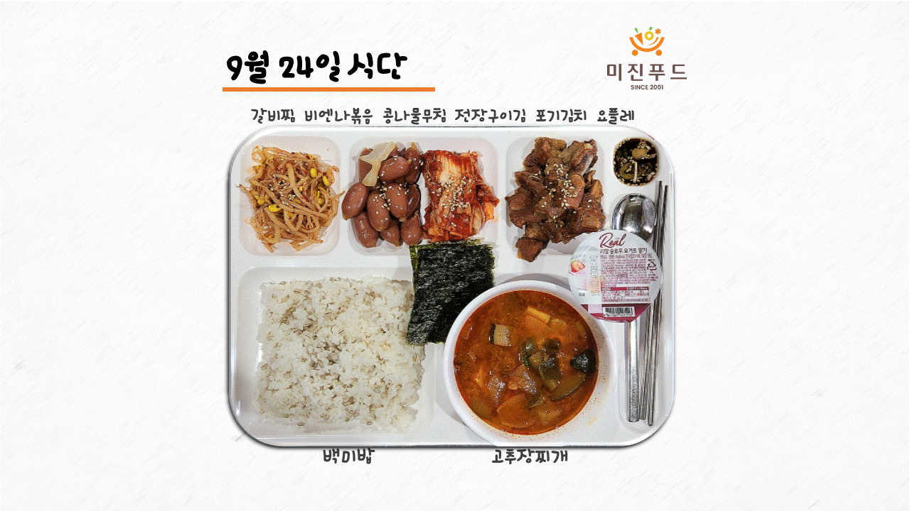 오늘의 식단: 갈비찜, 비엔나볶음, 전장구이김, 콩나물무침, 포기김치, 요플레, 고추장찌개, 백미밥 사랑합니다:)