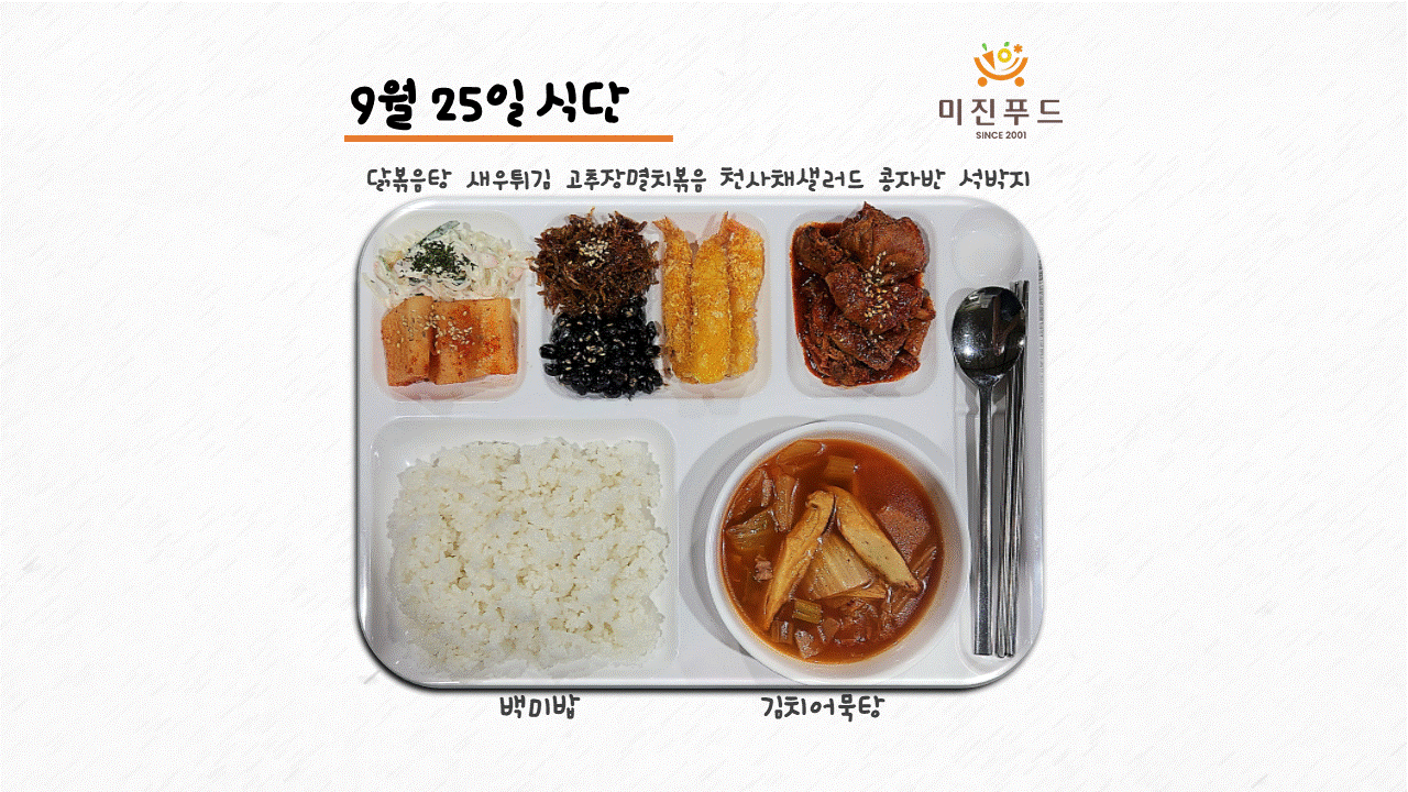 오늘의 식단: 닭볶음탕, 새우튀김, 고추장멸치볶음, 검은콩자반, 천사채샐러드, 석박지, 김치어묵탕, 백미밥 감사합니다:)