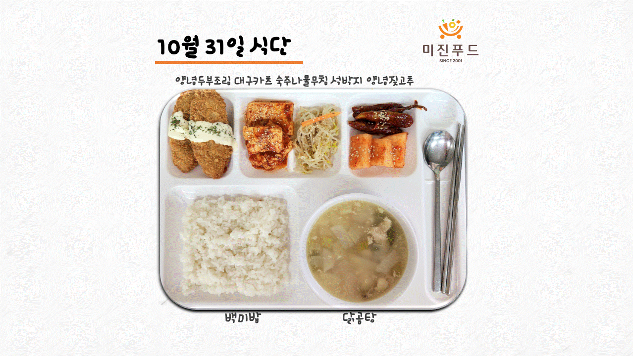 오늘의 식단: 양념두부조림, 대구카츠, 숙주나물무침, 석박지, 양념짖고추, 닭곰탕, 백미밥 사랑합니다:)