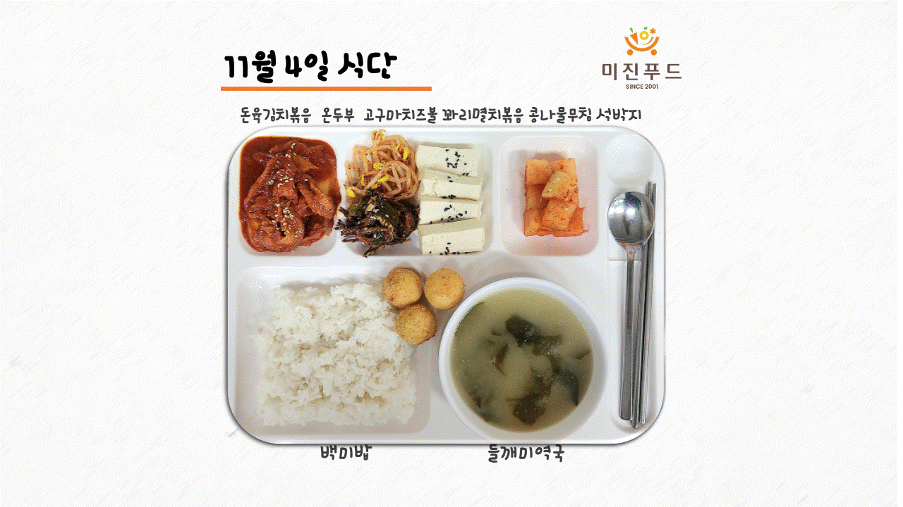 오늘의 식단: 돈육김치볶음, 온두부, 고구마치즈볼, 꽈리멸치볶음, 콩나물무침, 석박지, 들깨미역국, 백미밥 사랑합니다:)