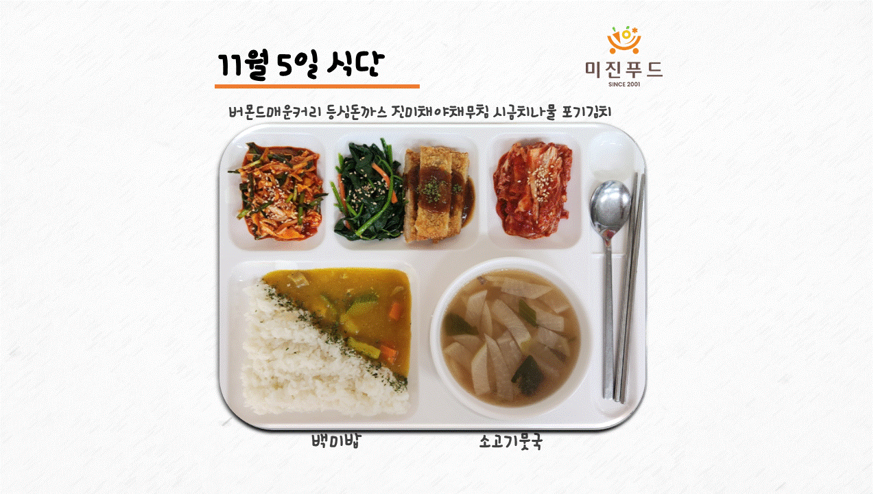 오늘의 식단: 매운커리, 등심돈까스&소스, 진미채야채무침, 시금치나물, 포기김치, 백미밥, 소고기뭇국 감사합니다:)고기만큼 비싼 시금치입니다 ..