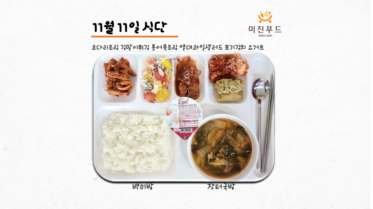 오늘의 식단: 코다리조림, 김말이튀김, 봉어묵조림, 열대과일샐러드, 포기김치, 리얼슬로우요거트, 장터국밥, 백미밥 사랑합니다:)