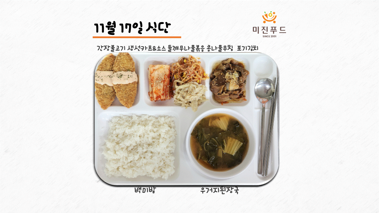 오늘의 식단: 간장청양불고기, 생선카츠&소스, 무나물들깨볶음, 콩나물무침, 포기김치, 우거지된장국, 백미밥 사랑합니다:)