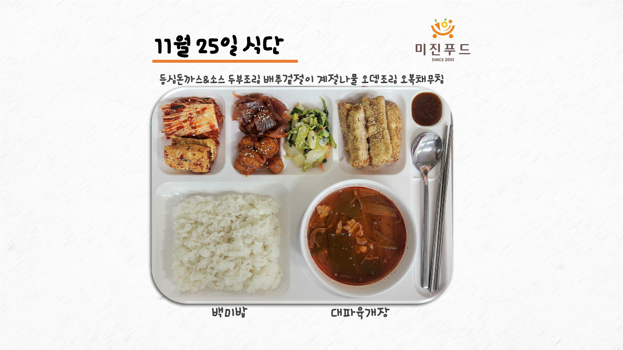 오늘의 식단: 등심돈까스&소스 두부조림 오뎅볶음 계절나물 오복채무침 포기김치 백미밥 대파육개장 감사합니다:)
