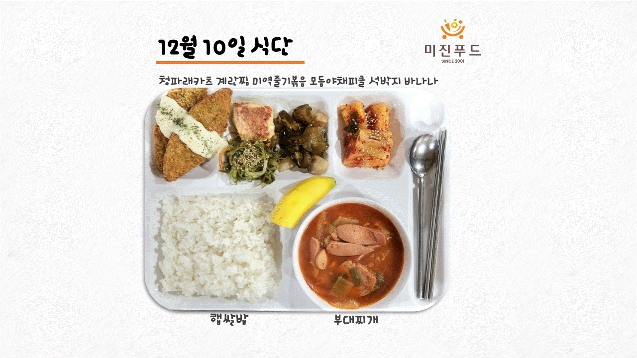 오늘의 식단: 청파래카츠 계란찜 미역줄기볶음 모듬야채피클 석박지 바나나 부대찌개 햅쌀밥 사랑합니다:)