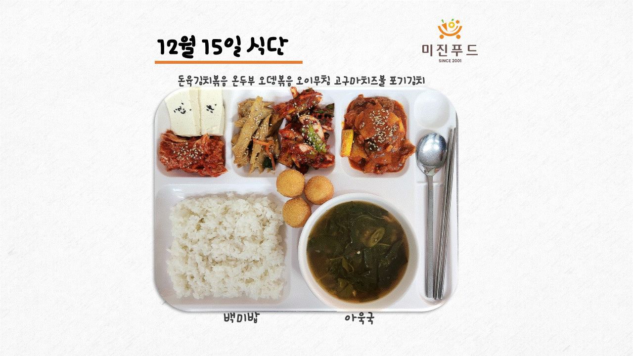 오늘의 식단: 돈육김치볶음, 온두부, 오뎅볶음 오이무침, 고구마치즈볼, 포기김치, 아욱국, 백미밥 감사합니다:)