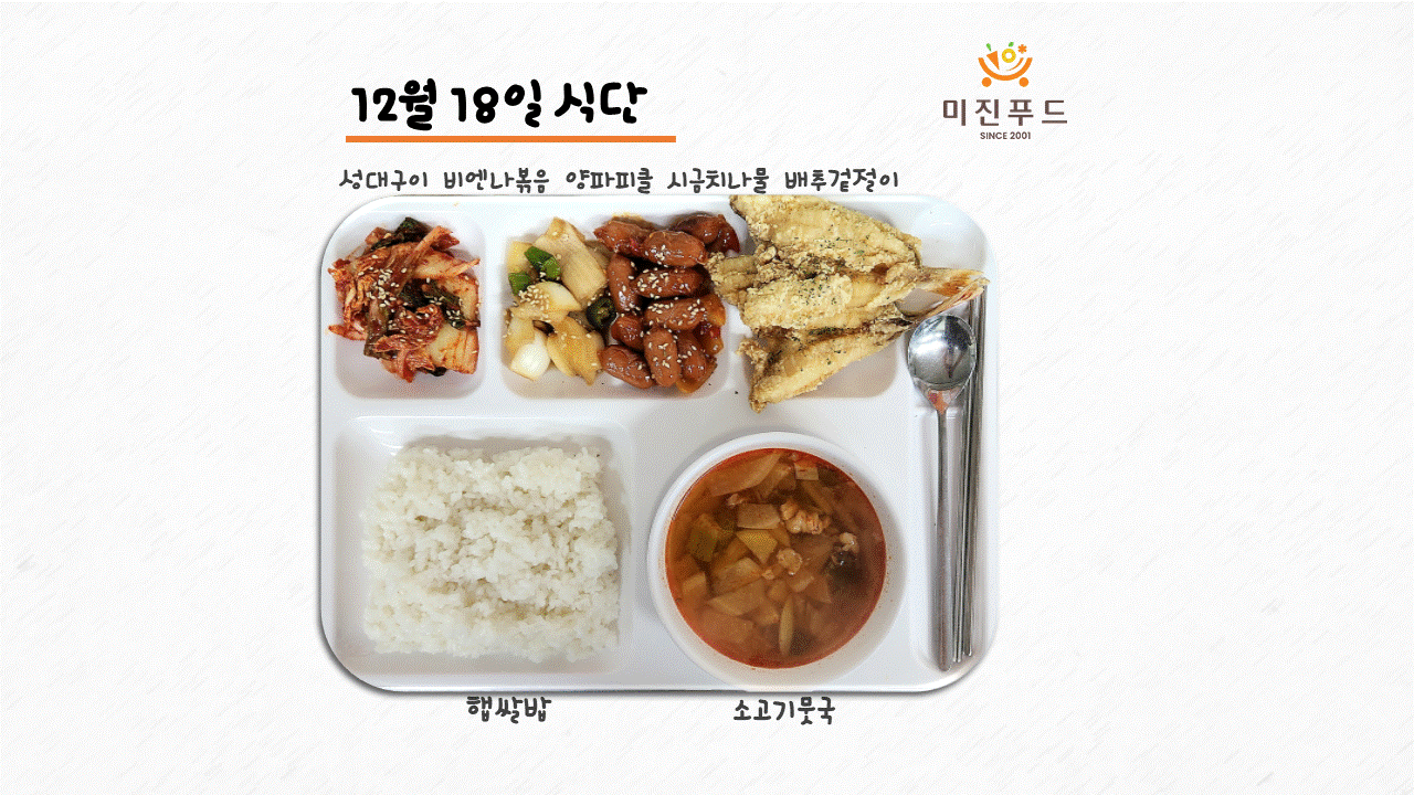 오늘의 식단: 성대구이, 비엔나볶음, 수제양파피클, 시금치무침(사진없음), 배추겉절이, 소고기뭇국, 백미밥 감사합니다:)