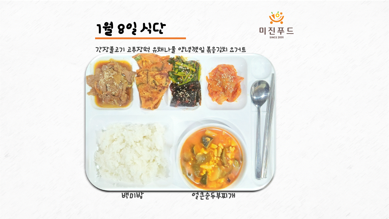 오늘의 식단: 간장불고기 고추장떡 유채나물 양념깻잎 볶음김치 얼큰순두부찌개 백미밥 요거트 사랑합니다:)