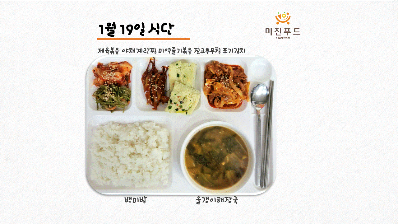 오늘의 식단: 제육볶음, 야채계란찜, 미역줄기볶음, 짖고추무침, 포기김치, 올갱이해장국, 백미밥 사랑합니다:)