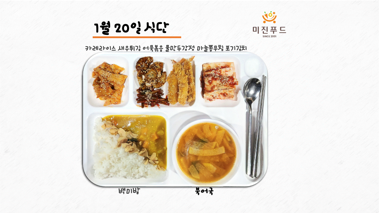 오늘의 식단: 카레라이스, 새우튀김, 물만두강정, 어묵볶음, 마늘쫑무침, 포기김치, 북엇국, 백미밥 사랑합니다:)