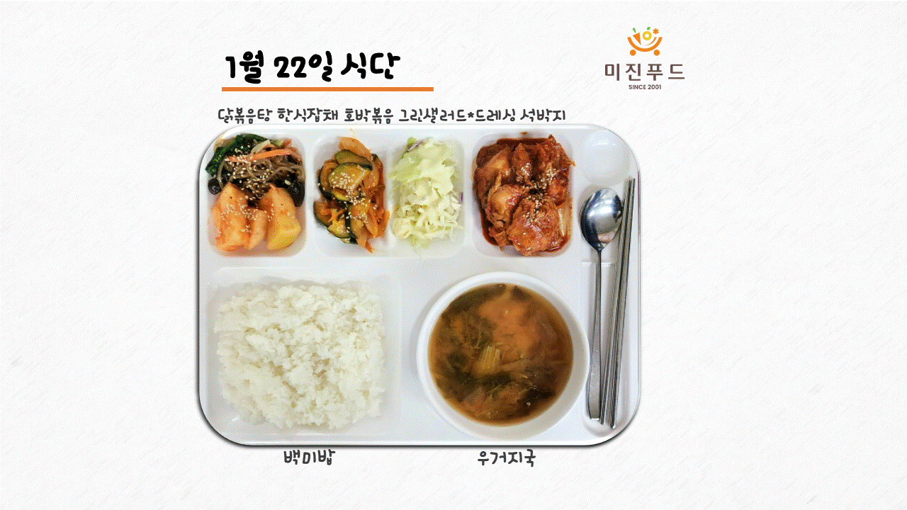 오늘의 식단: 닭볶음탕, 한식잡채, 호박볶음, 그린샐러드&드레싱, 석박지, 깨찰도넛(사진빠짐) 우거지국, 백미밥 사랑합니다:)