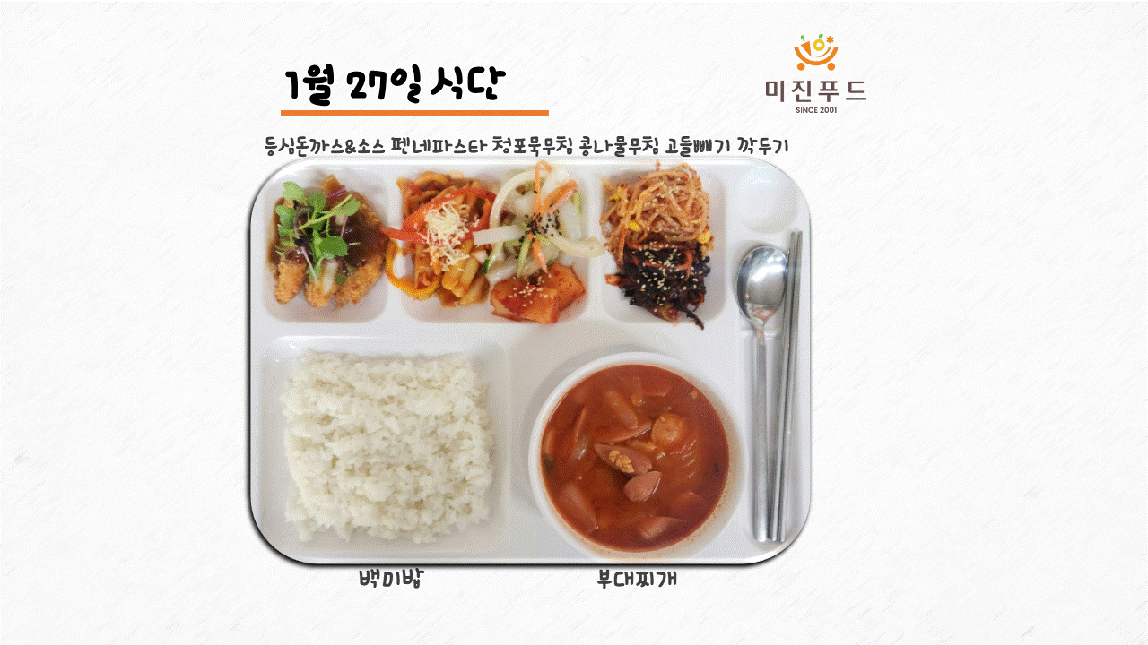 오늘의 식단: 등심돈까스&소스 청포묵무침 펜네파스타 고들빼기무침 콩나물무침 깍두기 백미밥 부대찌개 사랑합니다!:)