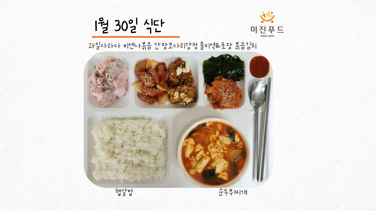 오늘의 식단: 햅쌀밥 순두부찌개 간장코다리간장 비엔나볶음 물미역&초장 과일사라다 볶음김치 사랑합니다!:)