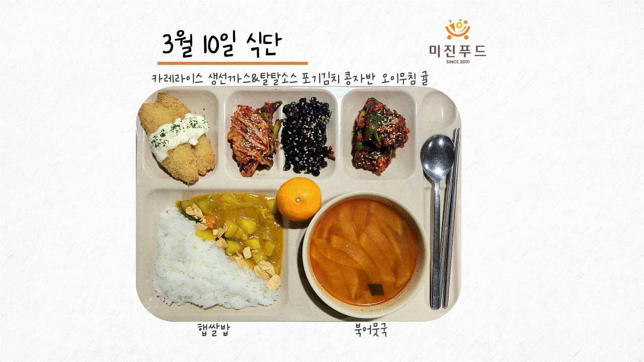 오늘의 식단: 햅쌀밥 북엇국 카레라이스 생선까스&탈탈소스 오이무침 콩자반 포기김치 귤 사랑합니다!:)