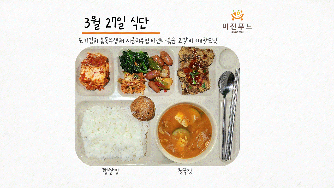 오늘의 식단: 햅쌀밥 청국장 고갈비 비엔나볶음 시금치무침 봄동무생채 깨찰도넛 포기김치 사랑합니다!:)