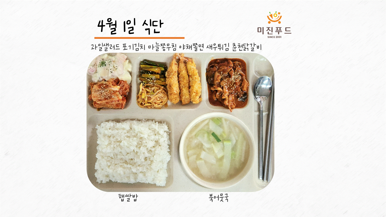오늘의 식단: 햅쌀밥 북어뭇국 춘천닭갈비 새우튀김 과일샐러드 마늘쫑무침 야채쫄면 포기김치 사랑합니다!:)