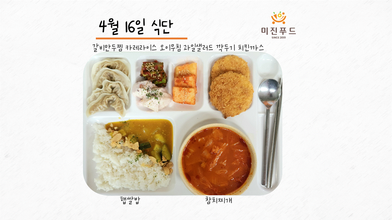 오늘의 식단: 햅쌀밥 참치찌개 카레라이스 치킨까스 갈비만두찜 오이무침 과일샐러드 깍두기 사랑합니다!:)